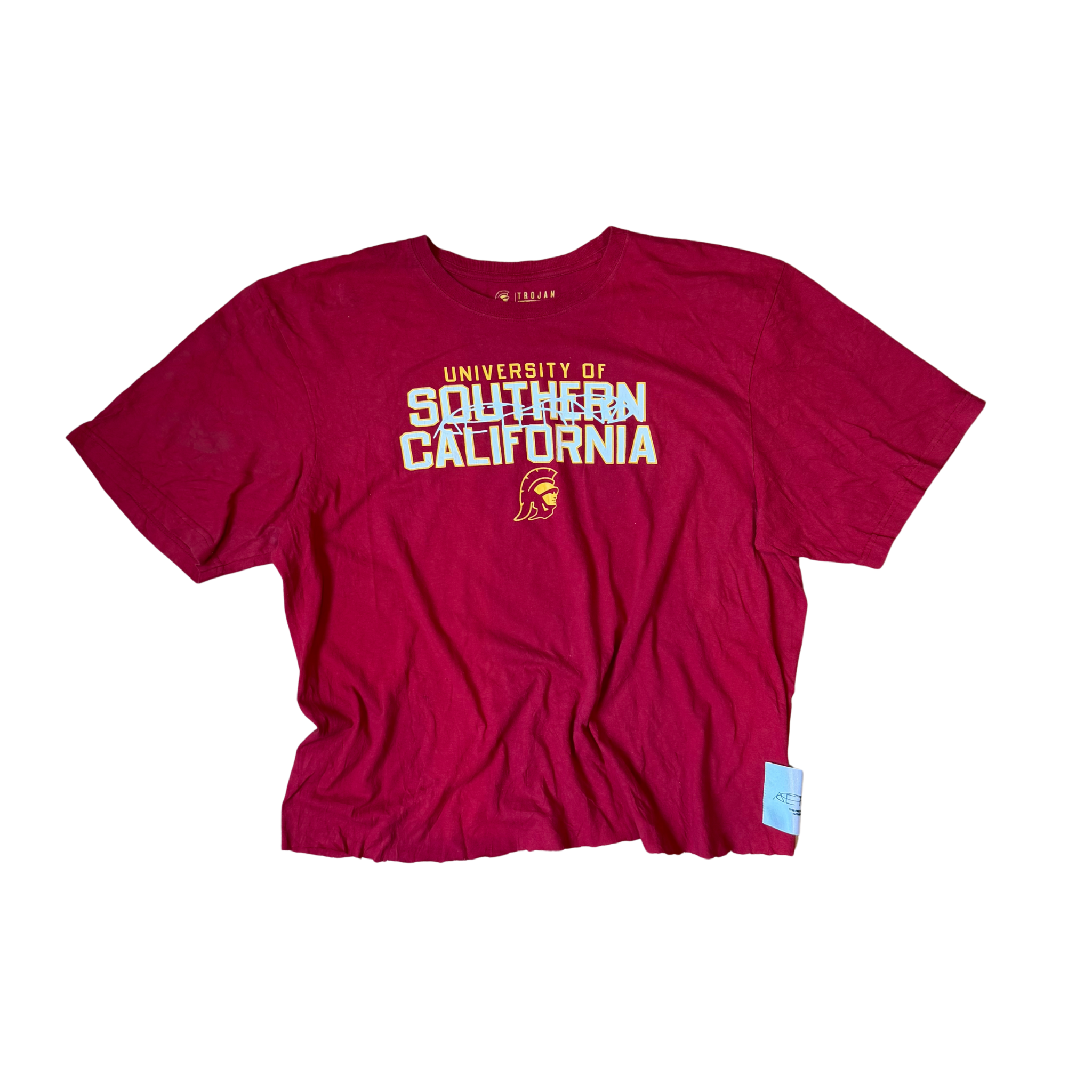 Classic cardinal-red collegiate tee featuring the original University of Southern California Trojans graphic, overlaid with a screen-printed Aeterna logo. Finished with a raw-cut hem for a worn-in edge and an Aeterna tag at the side.