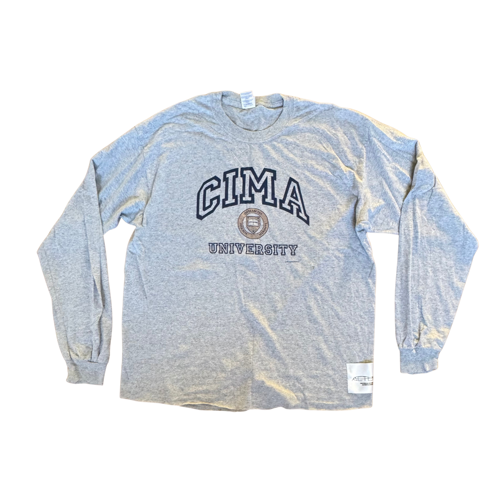 Classic heather-grey collegiate long sleeve featuring the original CIMA University crest and varsity lettering. Soft, mid-weight cotton gives it a relaxed, authentic campus feel, finished with a subtle Aeterna tag at the hem.