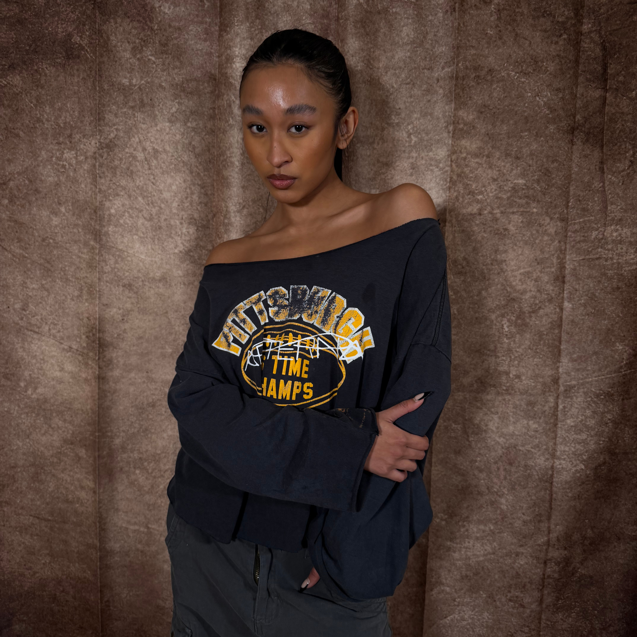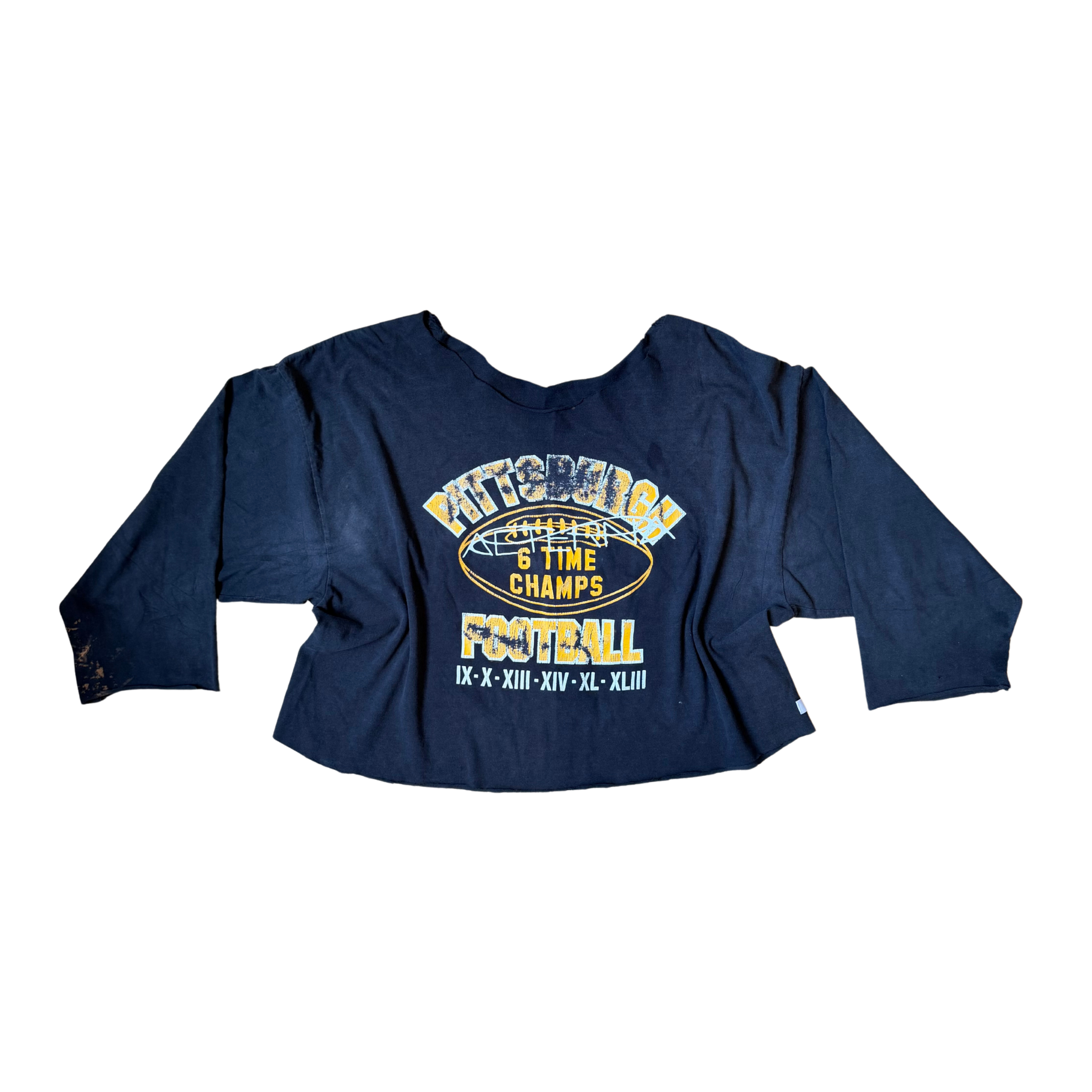 Classic navy Steelers-era tee featuring the original Pittsburgh Football — 6 Time Champs graphic with Super Bowl numerals Aeterna Screen printed overlay. Reworked with a wide raw-cut crop and a distressed neckline for a lived-in, deconstructed look, finished with the signature Aeterna tag at the hem.