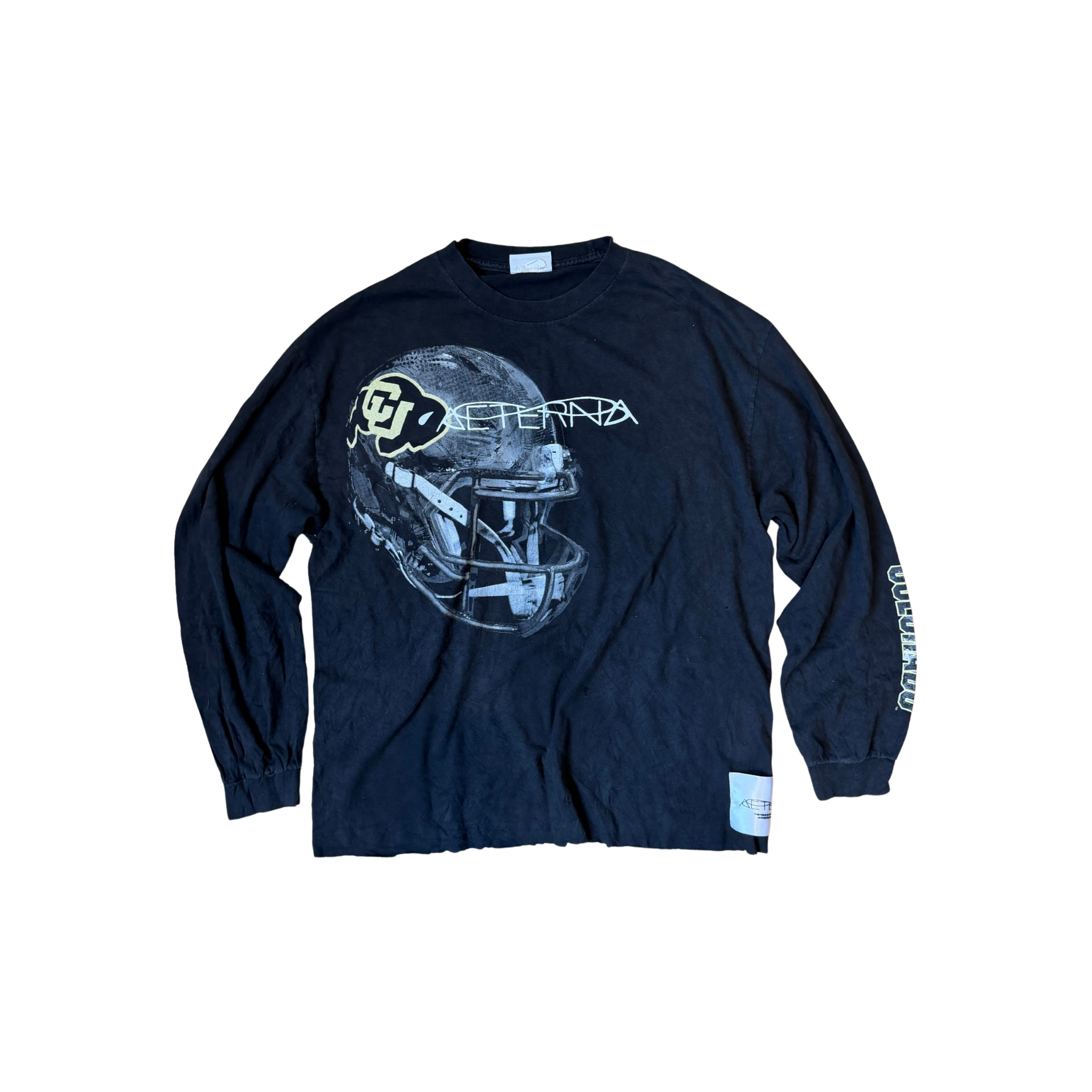 Classic black collegiate long sleeve featuring the original Colorado Buffaloes helmet graphic, overlaid with a screen-printed Aeterna logo across the chest. Finished with Colorado lettering down the sleeve and the signature Aeterna tag at the hem.
