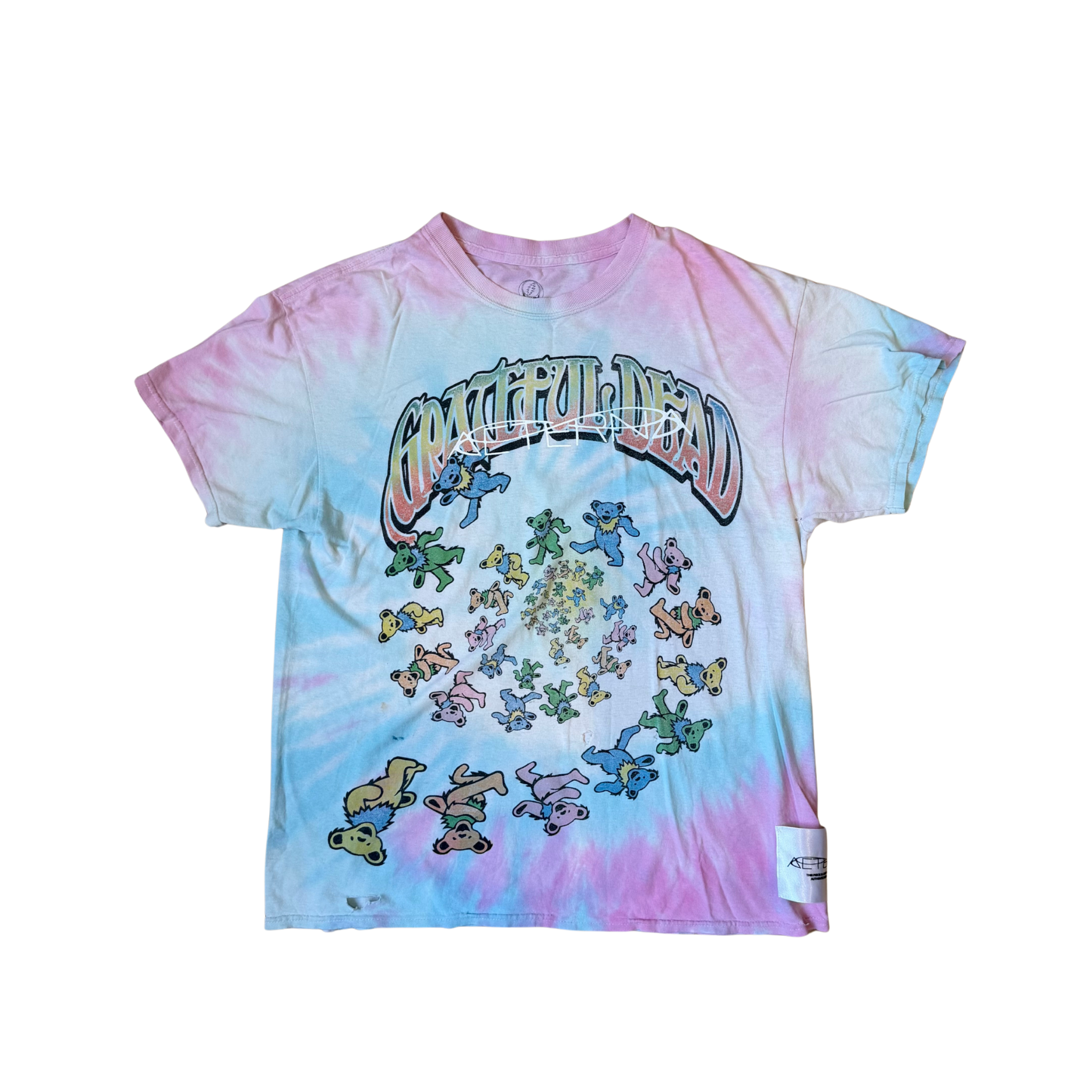 Classic 90s pastel tie-dye tee featuring the iconic Grateful Dead Dancing Bears spiral graphic, overlaid with a screen-printed Aeterna logo across the chest. Finished with a raw-cut hem and an Aeterna tag at the side for a modern, reworked edge.
