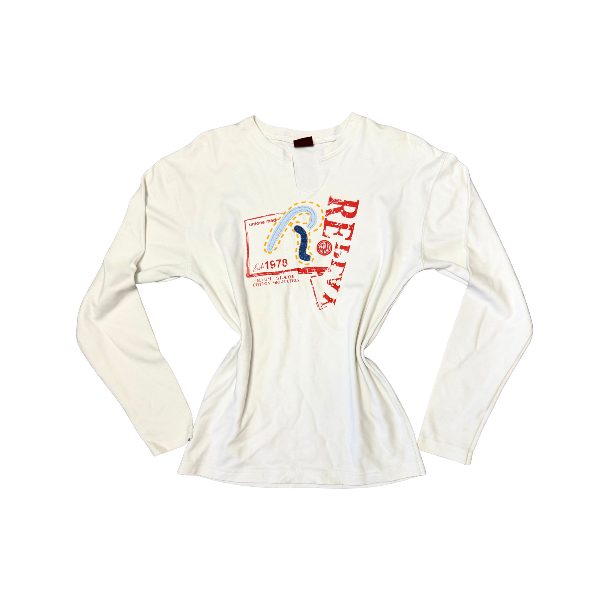 Archive Replay long sleeve top in off-white cotton, featuring the original graphic print across the chest with classic Replay branding and heritage detailing. This piece has been reworked with a cropped length and cinched-in waist, reshaping the original silhouette into a sculpted, body-contouring form while retaining the integrity of the vintage garment.