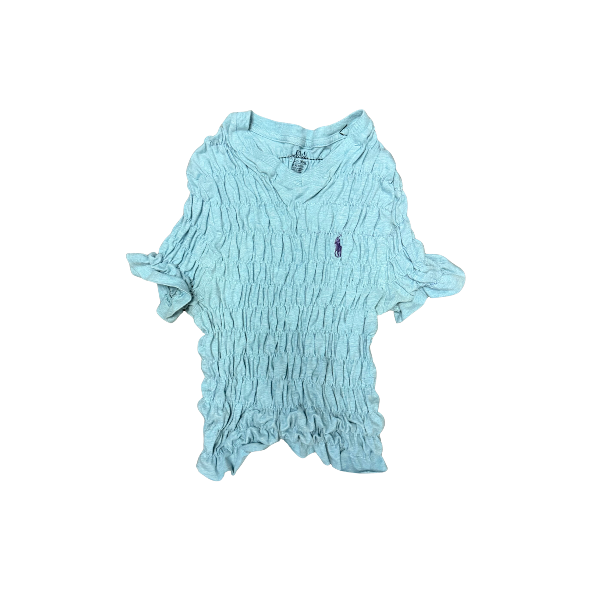 Archive Polo Ralph Lauren T-shirt in a soft pale blue cotton, featuring the original embroidered Polo pony at the chest. This piece has been fully reworked with elasticated gathering throughout the body, transforming the original silhouette into a highly textured, sculptural form with natural stretch and movement.