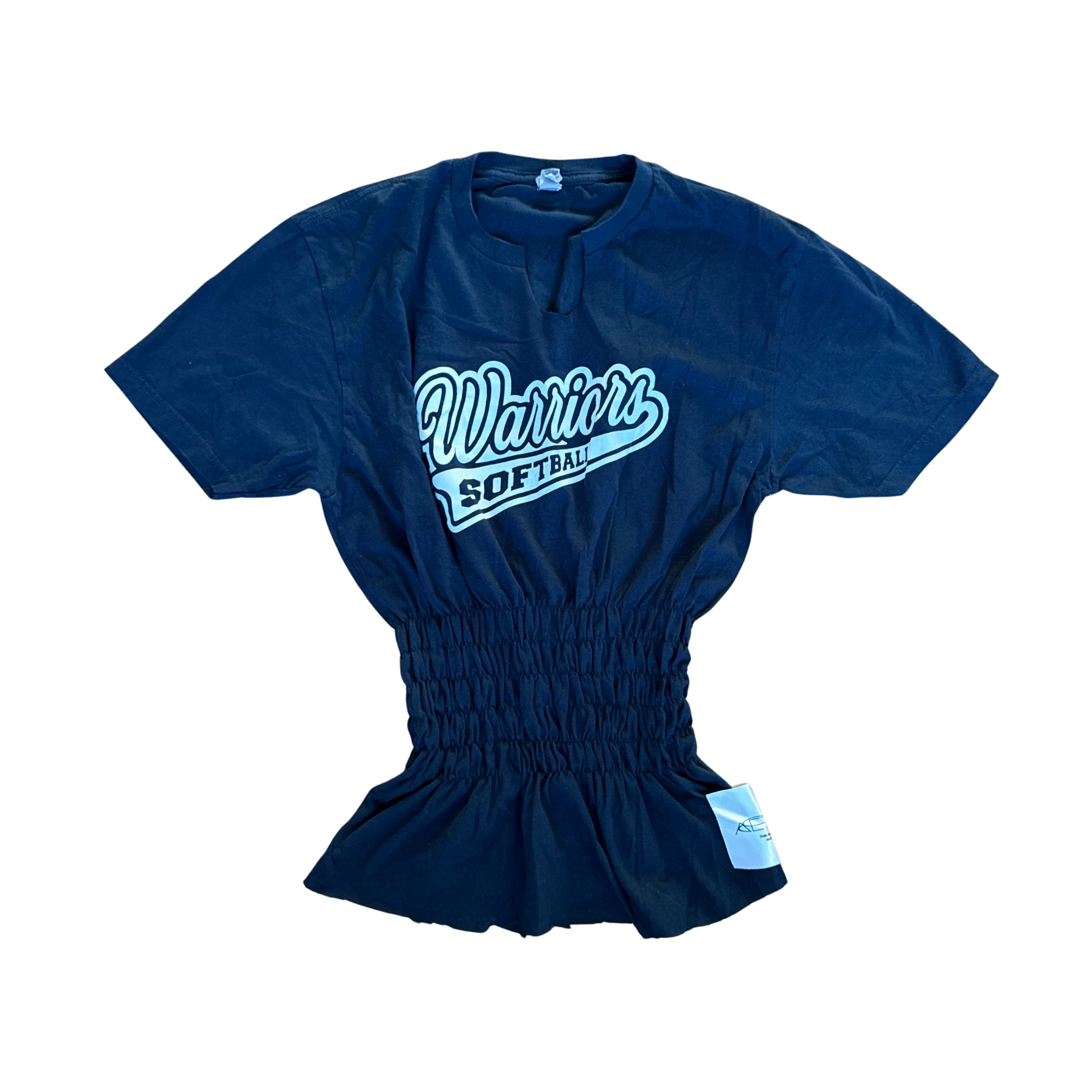 Classic team-logo softball tee reworked with full hand-shirred cinching through the waist to create a sculpted, fitted silhouette. Features the original Warriors Softball graphic in bold athletic lettering.