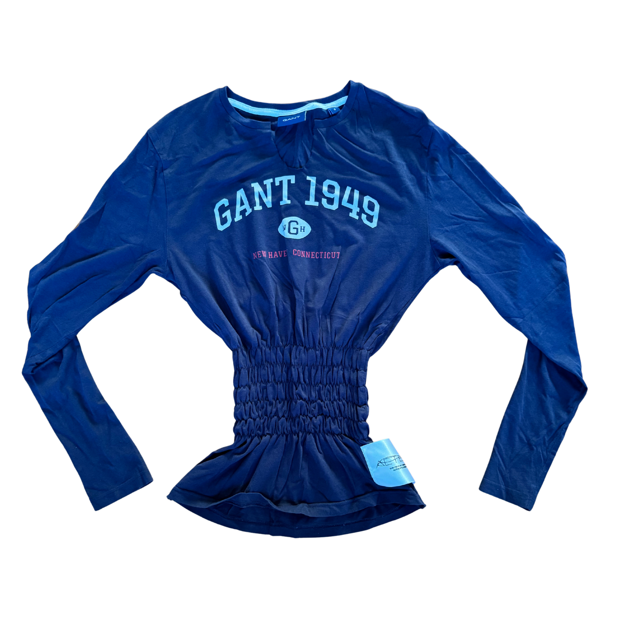 Hand smocked cinched waist silhouette with subtle raw detailing, featuring the original collegiate GANT 1949 front print. Reworked from a classic long sleeve into a sculpted, fitted shape.