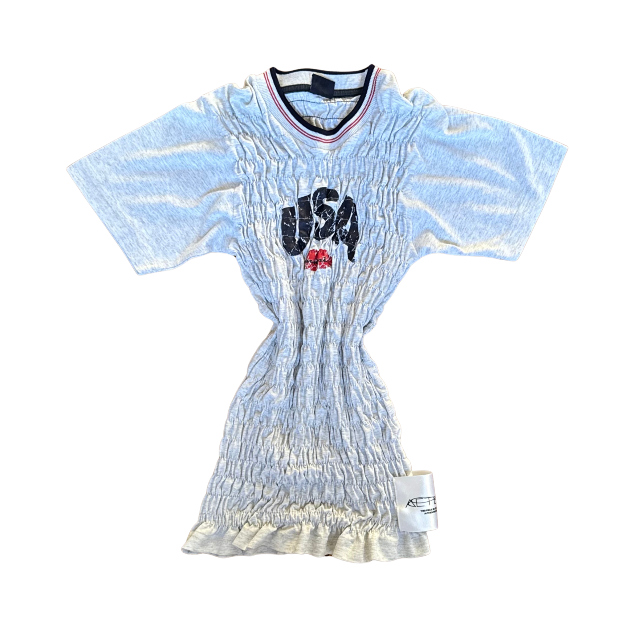 Classic heather grey USA graphic tee transformed with full hand smocked detailing, creating a sculpted, cinched silhouette. Features the original distressed USA print with bold red accenting and a retro striped collar.