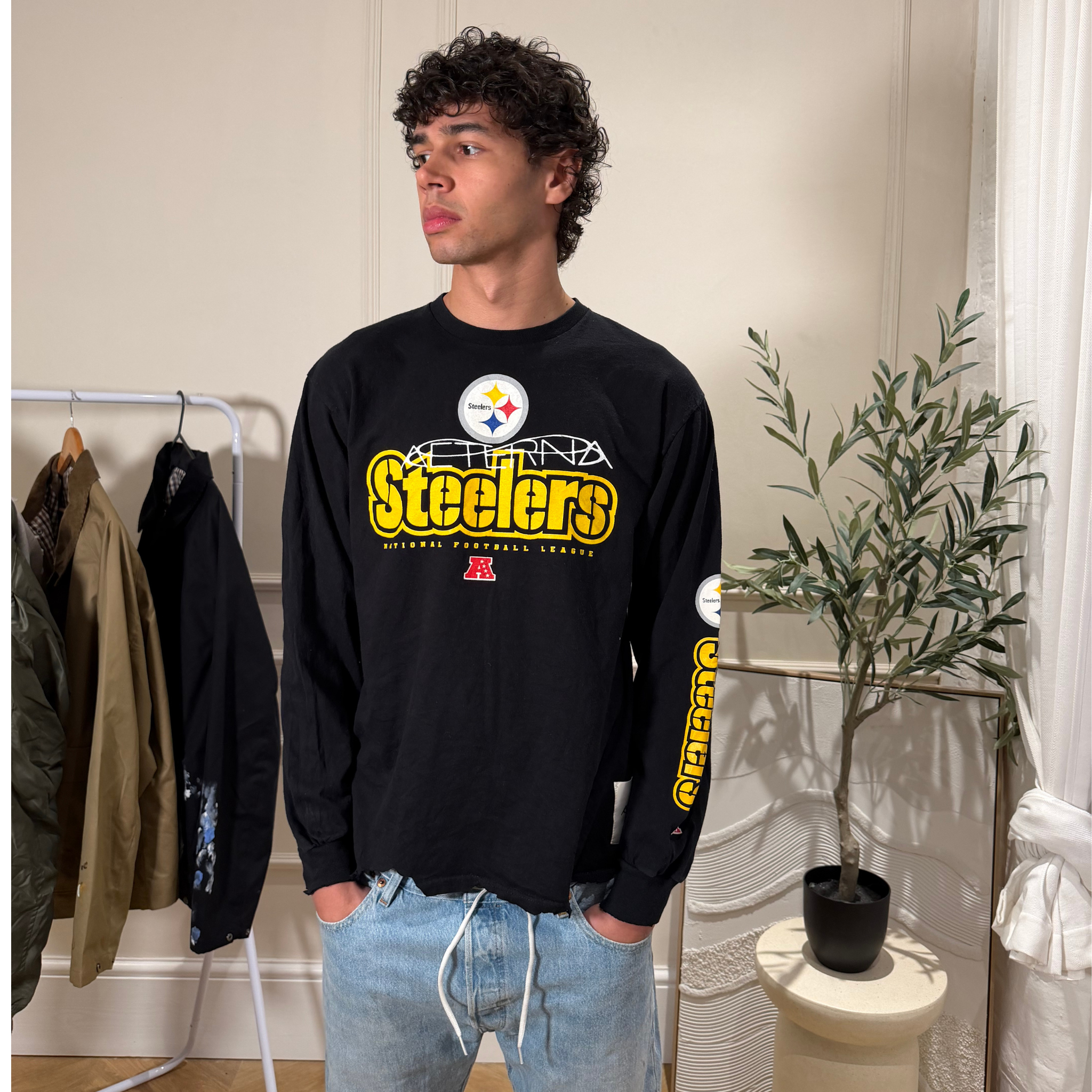 Classic black NFL long sleeve featuring the original Steelers logo and sleeve graphics, overlaid with a screen-printed Aeterna logo across the chest. Reworked with a subtle raw-cut hem for a modern, worn-in finish and completed with the signature Aeterna tag at the side.