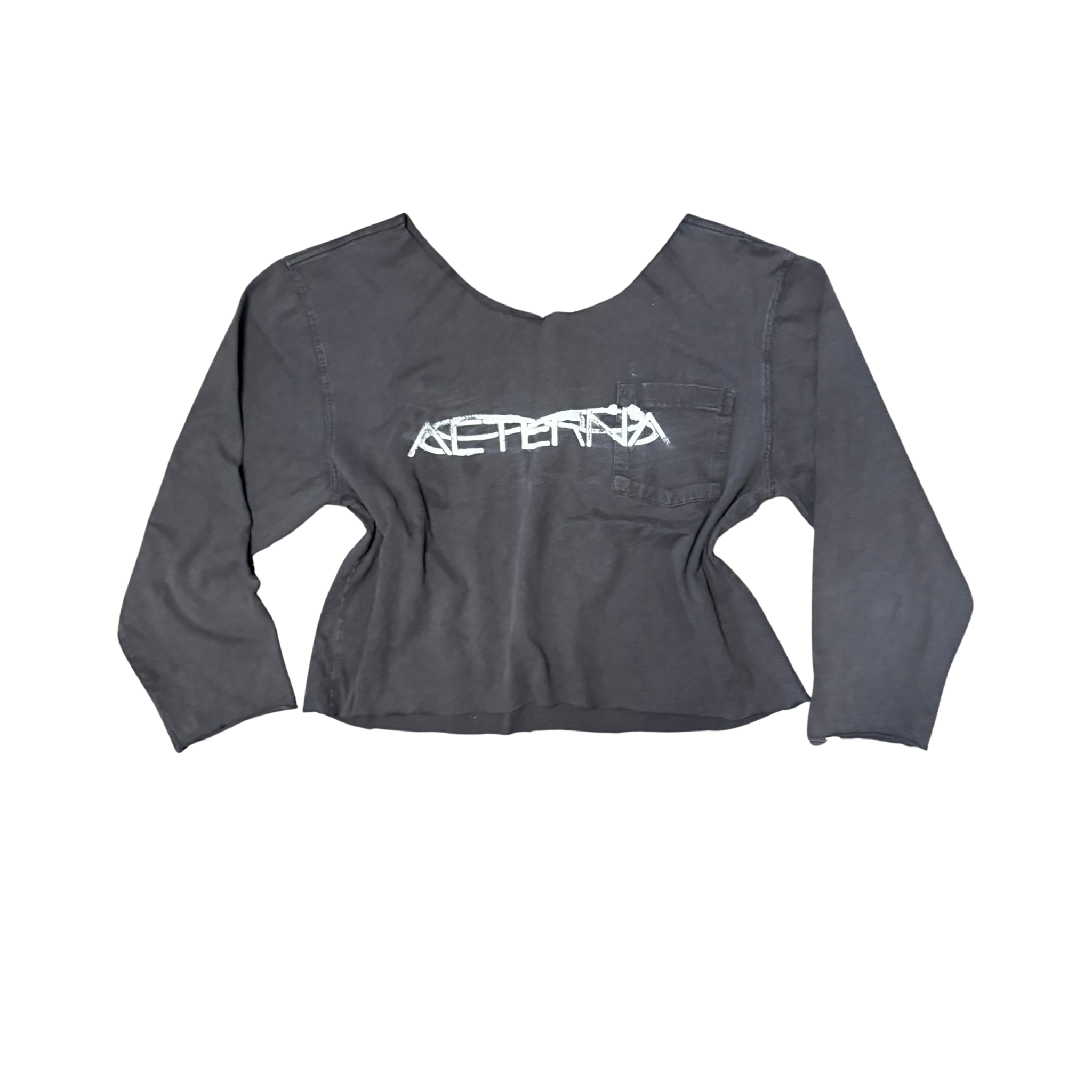 Authentic vintage long sleeve T-shirt in washed charcoal grey, hand-printed in-house by Aeterna with a bold linear logo graphic across the chest. This piece has been reworked with a cropped length and cinched-in waist, reshaping the original silhouette into a sculpted, fitted form.