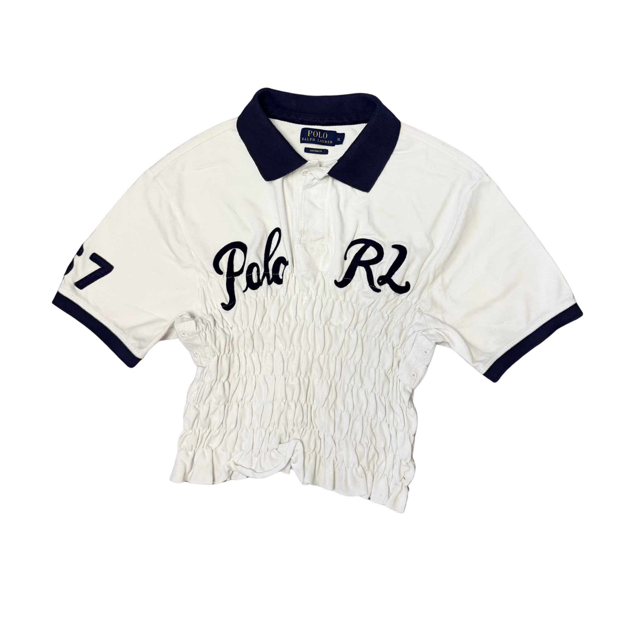 Archive Polo Ralph Lauren short-sleeve polo in off-white cotton, featuring the original Polo RL embroidered script at the chest with contrasting navy collar and sleeve trims. This piece has been reworked with an elasticated waist, introducing gathered structure through the midsection and transforming the classic polo silhouette into a cropped, sculpted form.